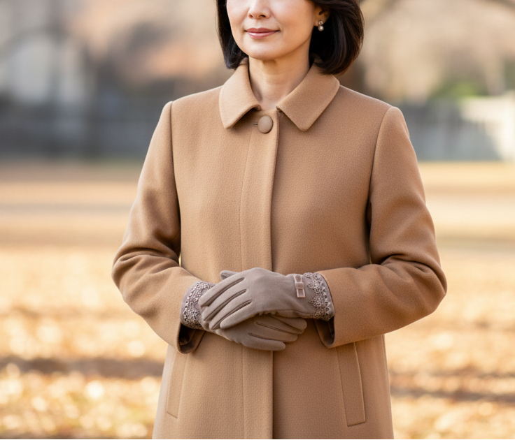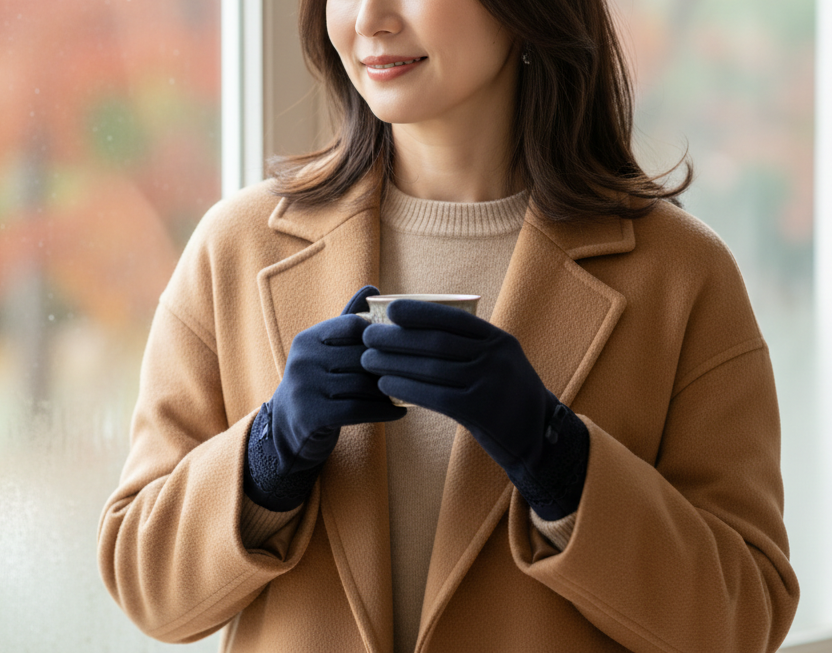 UVアームカバーの技術を生かした秋冬用の薄手手袋の新色。上品で繊細なデザインが、美しさを引き立てます。人差し指と親指が出せる仕様のため、手袋を着けたままスマートフォンの操作が可能です。