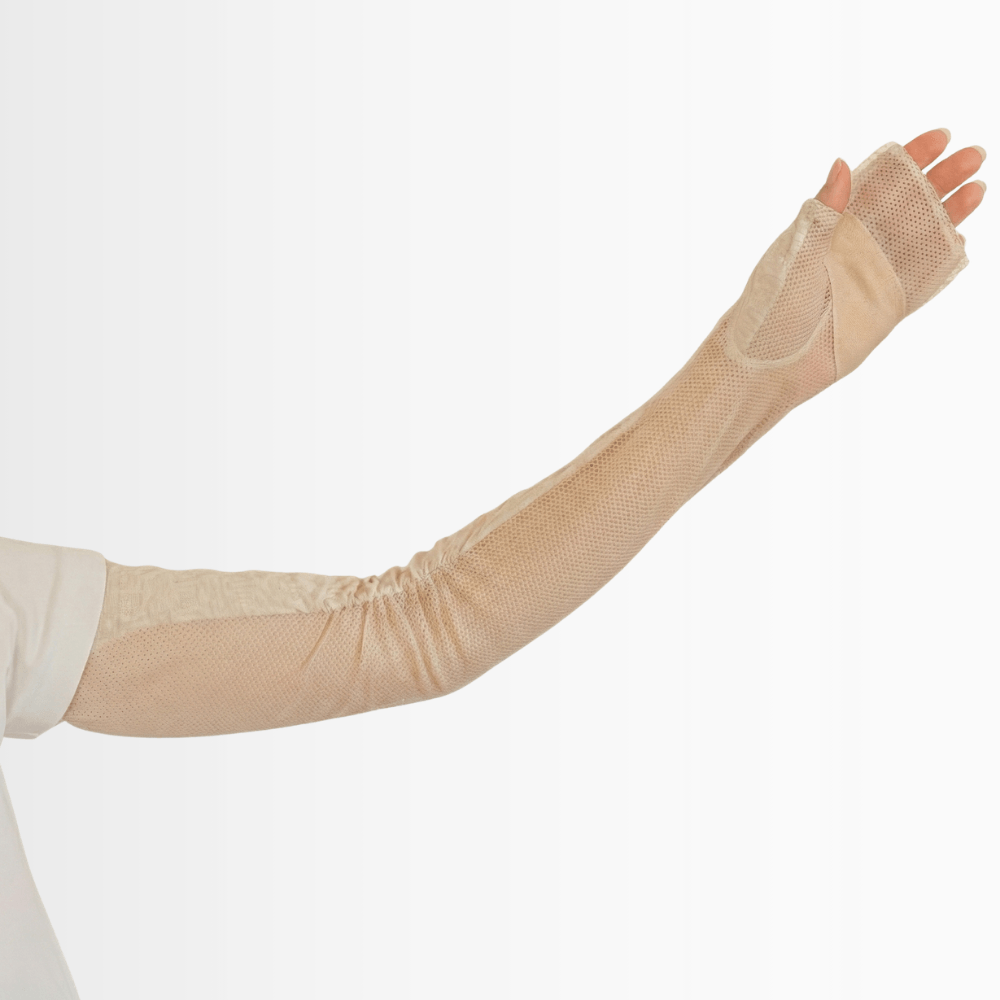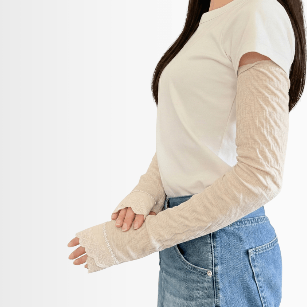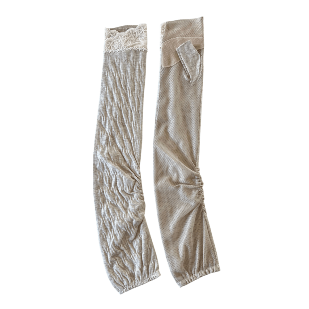 肘の内側部分に繊細な絞り加工を施すことで、装着時に腕のラインを美しく見せるエレガントなシルエットを追求。単なる日除けとしてだけでなく、お洋服の一部として手元を華やかに演出するこだわりの一品です。
