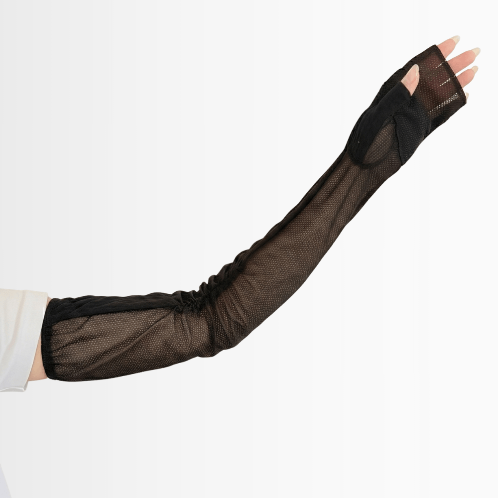 | 機能性 | UV加工済、吸湿・通気メッシュ構造、滑り止め付、指先オープン設計、肘絞り加工 |